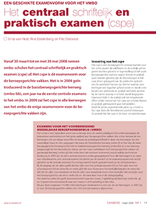Vanaf 30 maart tot en met 30 mei 2008 nemen vmbo-scholen het centraal schriftelijk en praktisch examen (cspe) af. Het cspe is dé examenvorm voor de beroepsgerichte vakken. Het is in 2004 geïntroduceerd in de basisberoepsgerichte leerweg (vmbo-bb), een jaar na de eerste centrale examens in het vmbo. In 2009 zal het cspe in alle leerwegen van het vmbo de enige examenvorm voor de beroepsgerichte vakken zijn.