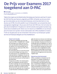 Tijdens het congres van de Nederlandse Vereniging voor Examens werd op 23 november 2017 de Prijs voor Examens uitgereikt aan D-PAC. Uit handen van de jury ontvingen de onderzoekers van de Universiteit Antwerpen, de Universiteit Gent en imec de prijs voor D-PAC, het