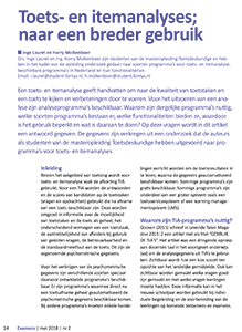 Een toets- en itemanalyse geeft handvatten om naar de kwaliteit van toetstaken en een toets te kijken en verbeteringen door te voeren. Voor het uitvoeren van een analyse zijn analyseprogramma’s beschikbaar. Waarom zijn dergelijke programma’s nuttig, welke soorten programma’s bestaan er, welke functionaliteiten bieden ze, waardoor is het gebruik beperkt en wat is daaraan te doen?